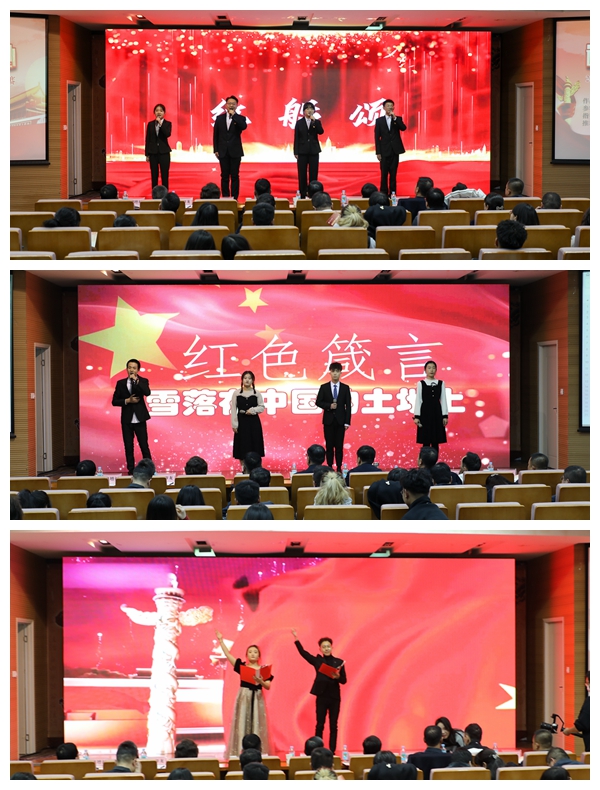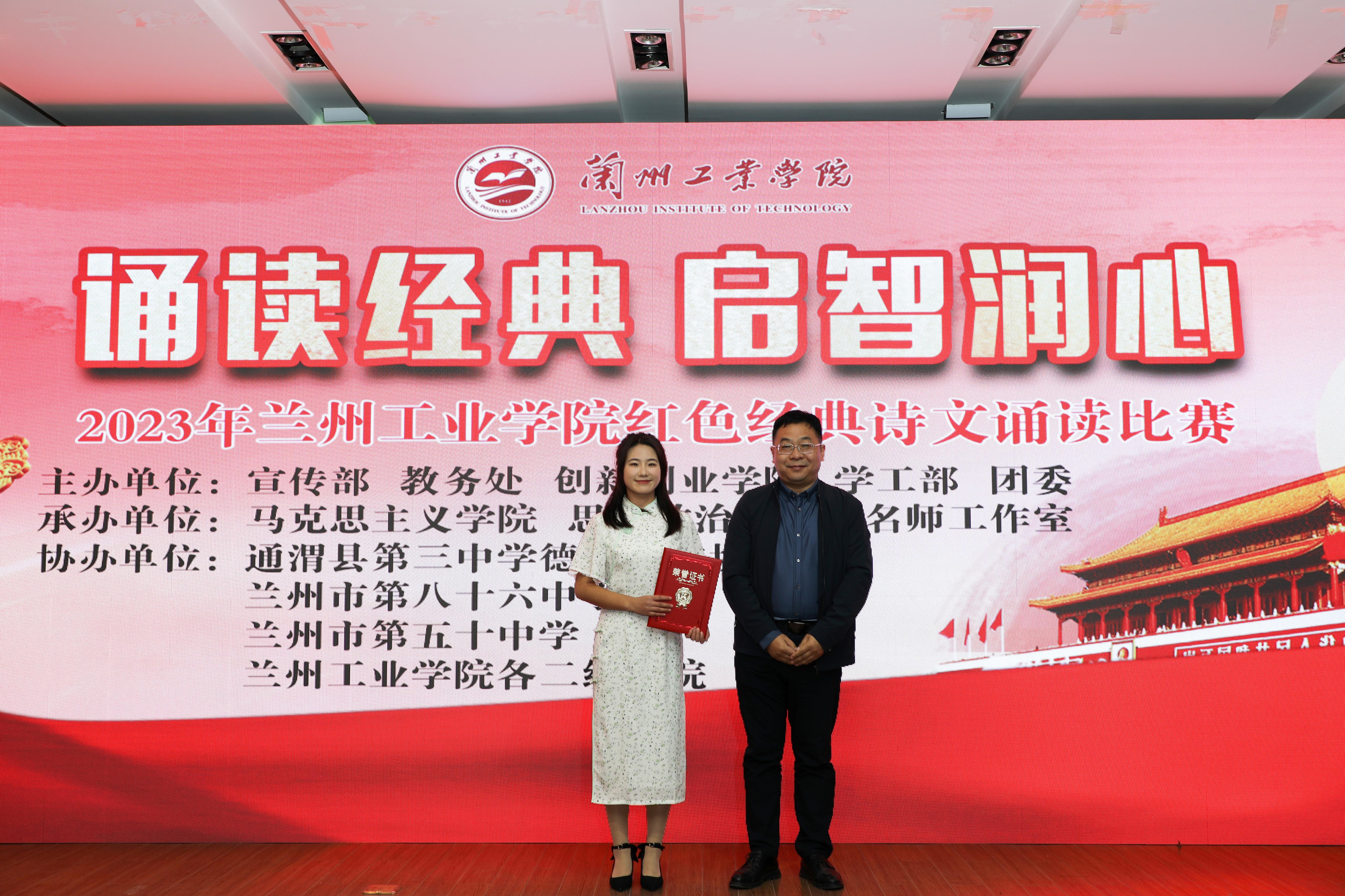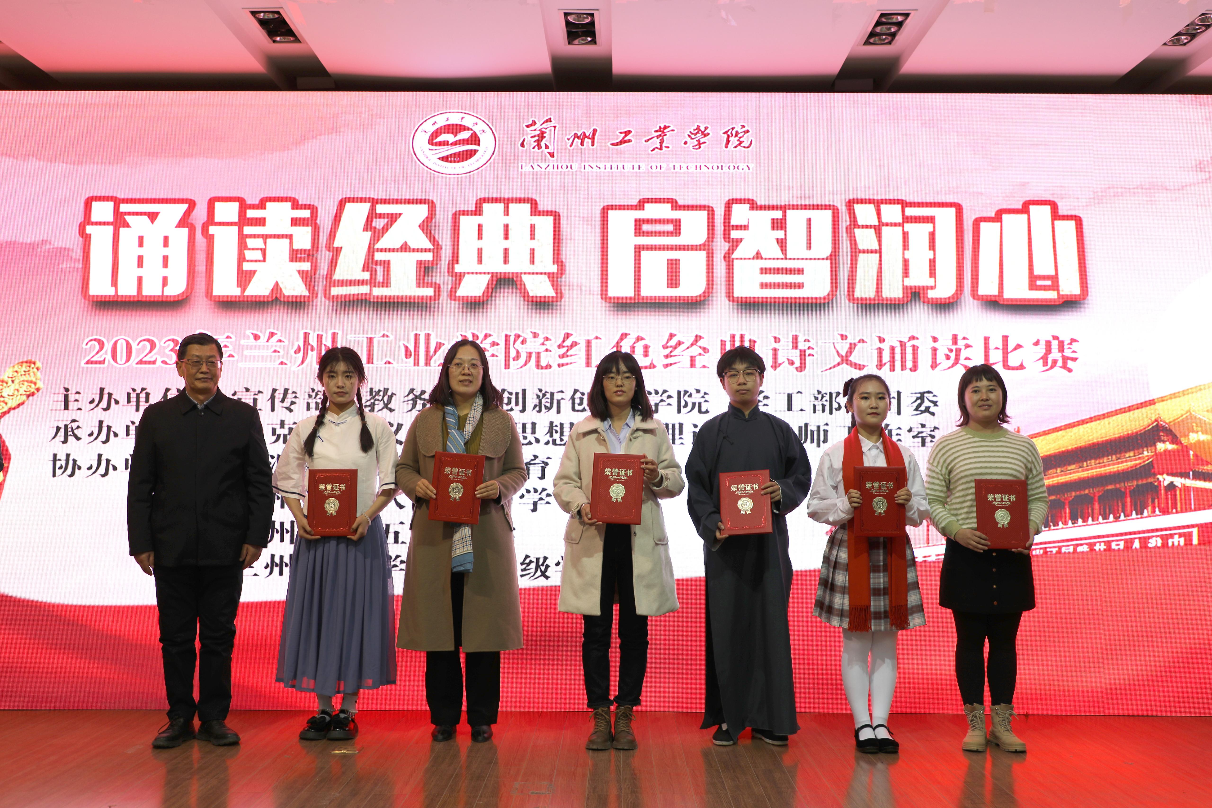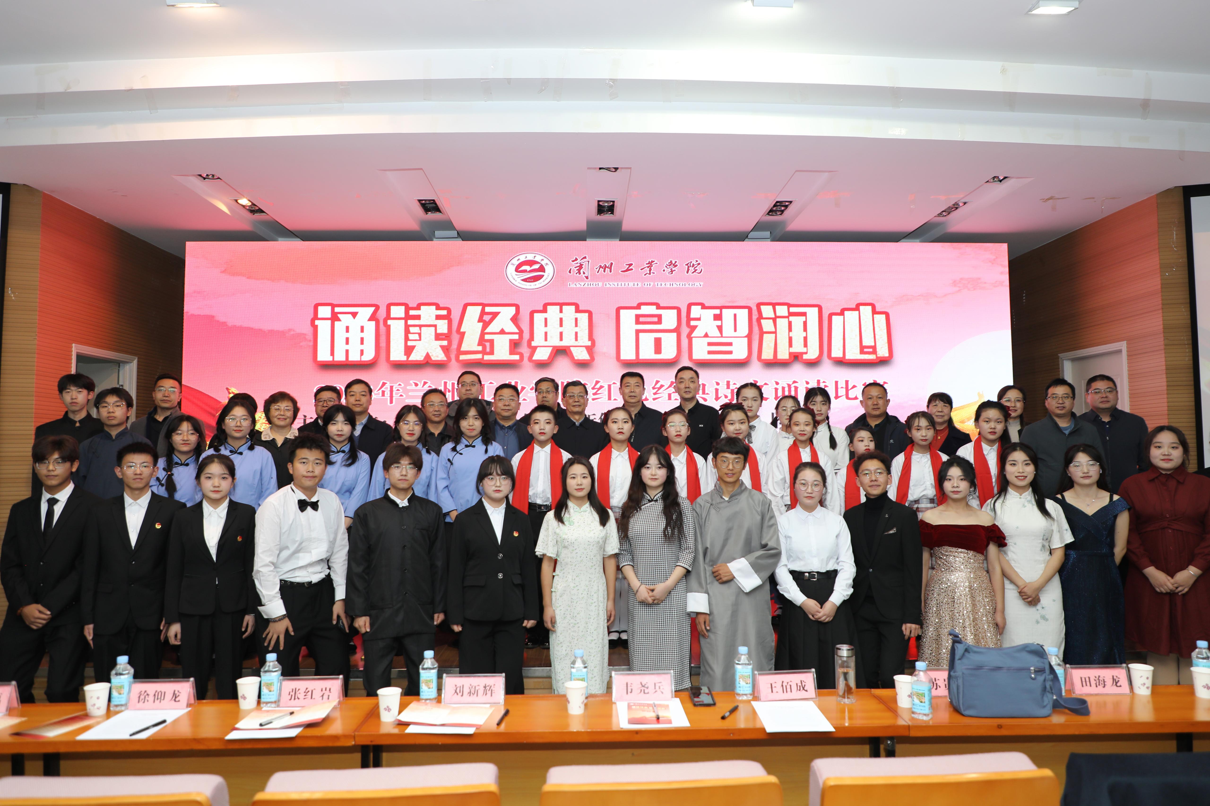 在诵读展演环节,天真可爱的兰州市第八十六中的小学生们带来作品《祖国啊,我亲爱的祖国》,充满青春朝气的通渭县第三中学带来作品《我的祖国到底是什么》和《青春中国》,兰州市第五十中学的初高中生们饱含深情地朗诵展演《青春之我》。在诵读决赛环节,经过各学院初赛、复赛,进入决赛的11支队伍热情讴歌祖国、抒发真挚情感,充分展现了青年学子的良好精神风貌。最终经过激烈角逐,经济管理学院代表队《吹号者》获一等奖,外国语学院代表队《红铁》、汽车工程学院代表队《秋瑾》分获二等奖,图书馆代表队《雪落在中国的土地上》、材料工程学院代表队《红船颂》、电气工程学院代表队《有一种力量叫中国精神》分获三等奖,电子信息工程学院代表队《百年恰是风华正茂》、土木工程学院代表队《我的祖国》、机电工程学院代表队《红色赞歌》、计算机与人工智能学院代表队《祖国颂》、艺术设计学院代表队《我爱你中国》分获优秀奖。