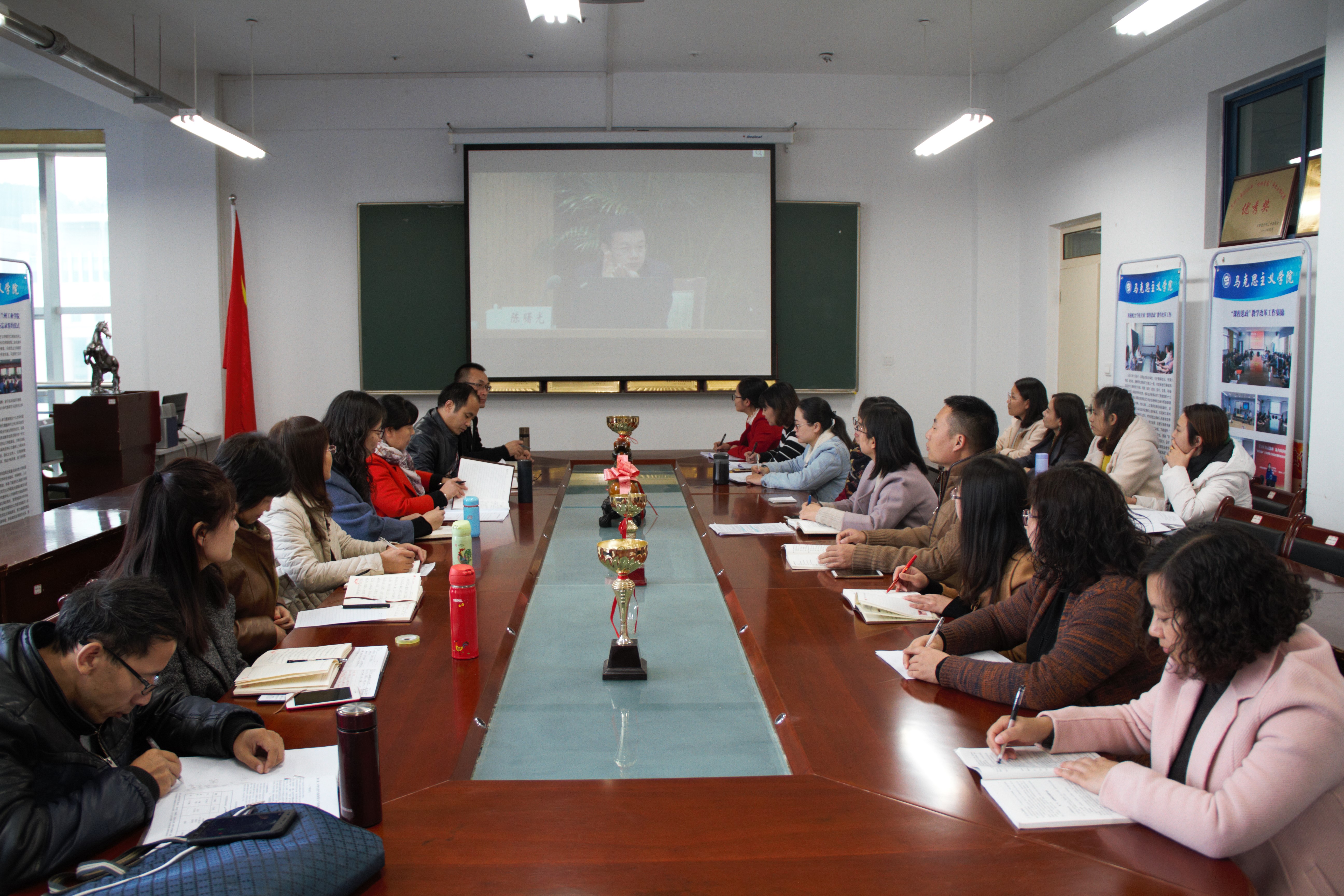 11月6日下午,根据教育部《关于做好高校研究生思想政治理论课2018年版教材(教学大纲)使用培训的通知》和省教育厅有关要求,马克思主义学院设置了培训分会场,以视频会的方式,同步直播教育部主办的高校研究生思想政治理论课2018年版教材(教学大纲)使用培训会。学院党总支书记王重贤主持会议,院长张小华、副院长张小东与教师一起参加了视频培训会。