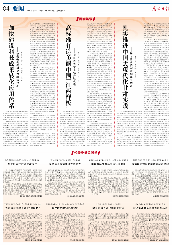 发展是第一要务,改革是根本动力。胡昌升代表说,甘肃将全力以赴促改革,直面时代课题、锐意开拓创新,立足甘肃科教资源相对丰富的省情实际,大力实施科教兴省、人才强省战略,打造西北地区重要的科创中心和人才高地。以更大气魄全面深化改革,在国资国企、财税金融、放管服、农业农村等重点领域和关键环节改革上下功夫,为现代化建设注入强劲动力。用足用好“一带一路”建设最大机遇,深度融入西部陆海新通道,大力发展外向型经济,推进高水平对外开放,为甘肃现代化建设拓展更为广阔的发展空间。